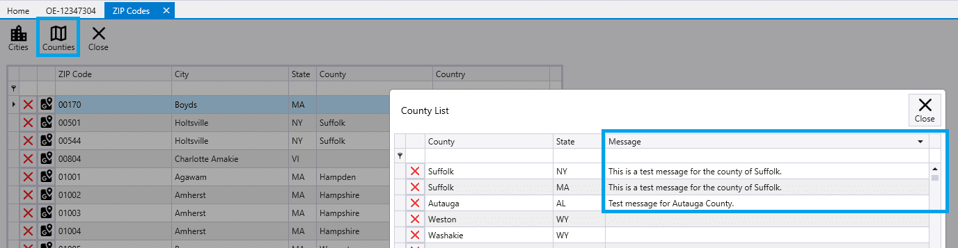 To add a county note, go to Zip Codes > Counties and enter the note.