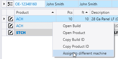 Right clicking the build in any of the production screens will show an option called “Assign to different machine”.