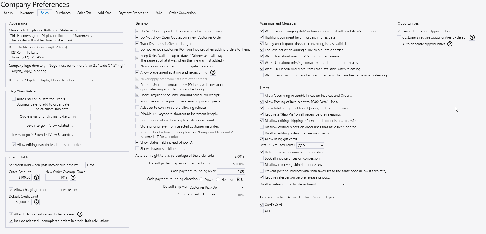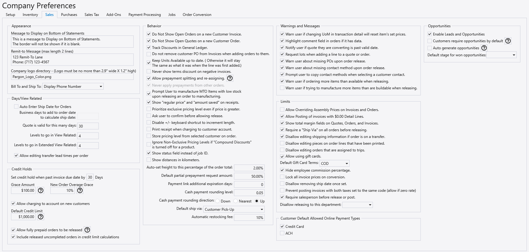 - Remit-to Message (max length 2 lines) – This will be displayed underneath the logo on customer statements, quotes, orders, invoices, pick tickets. Going over 2 lines may cause the message to display on top of other fields.