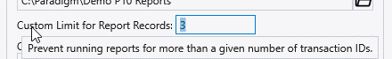 This setting allows a maximum number of transactions to be included in any single printed or exported file. In normal use, this setting should not be required and is intended only for situations in which very large batches, typically in excess of 400 records, are causing Paradigm to respond slower than expected.