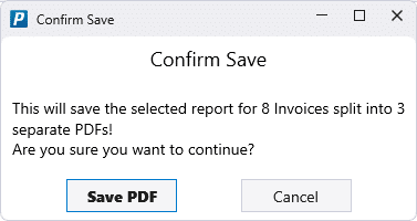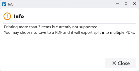 Attempting to print a number of transactions that exceeds the set limit will not succeed. For the example given previously, the following error will show: “Printing more than 3 items is not currently supported. You may choose to save to a PDF and it will export split into multiple PDFs.” The exception to this is printing from the Inventory List page, which does not check the number of records against this setting.