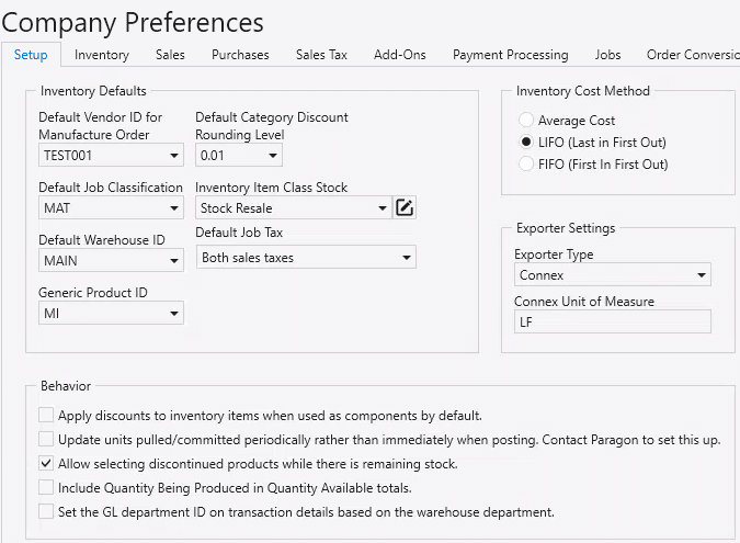 - Default Vendor ID for Manufacture Order – The default vendor when a manufacture order is created.