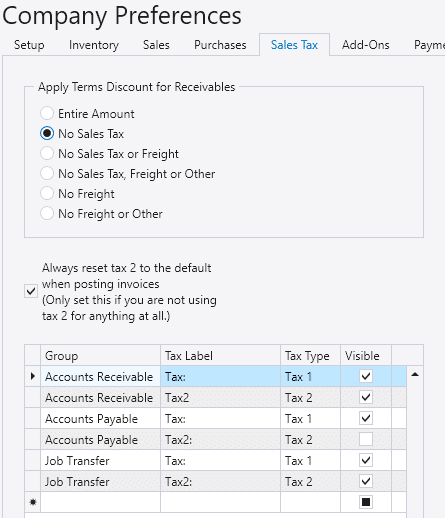 - Always reset tax 2 to the default when posting invoices (Only set this if you are not using tax 2 for anything at all) – Resets tax 2 to default when the invoice is posted.
