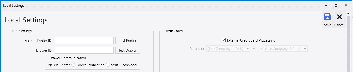 Go to System > Local Settings > Credit Cards. Then select the “External Credit Card Processing” checkbox and the set up is complete. Enabling this disables any other processors/configurations set.