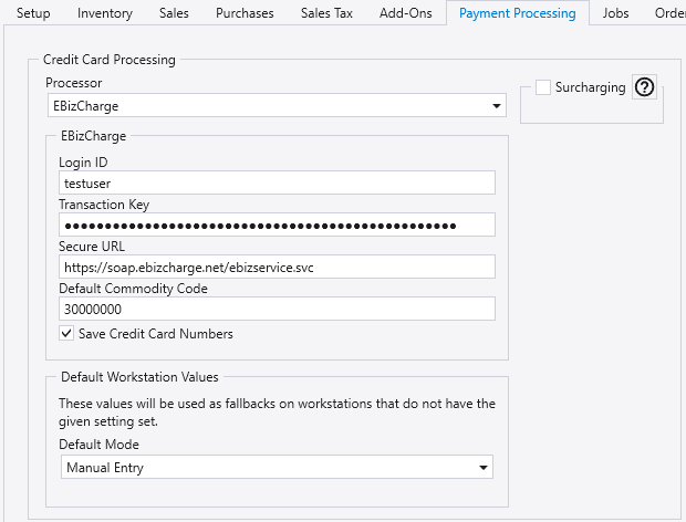 - If the workstation would like to jump between companies with different EBizCharge accounts for each company, these should be left empty.