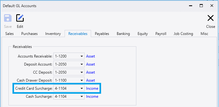 Surcharges will post to the account selected in the Default GL Accounts, shown below: