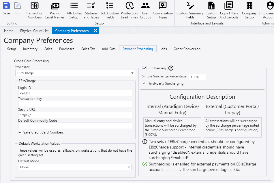 Payments made outside Paradigm, such as through the customer portal or other web-based systems, normally use Third-party Surcharging via EBizCharge. In a hybrid setup, Paradigm will still apply Simple Surcharging internally, while the web continues using Third-party Surcharging. When both options are available to a workstation, it will use the Simple (Internal) surcharging.