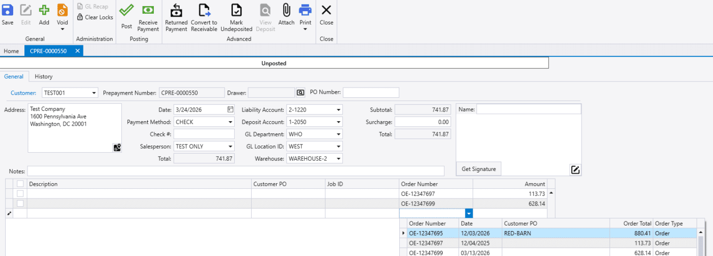 Then select the orders from the drop down and enter the amount being applied. Double clicking the amount field will bring in the balance due for the order. If no orders are selected, the prepayment will be applied to the customers account for later use.