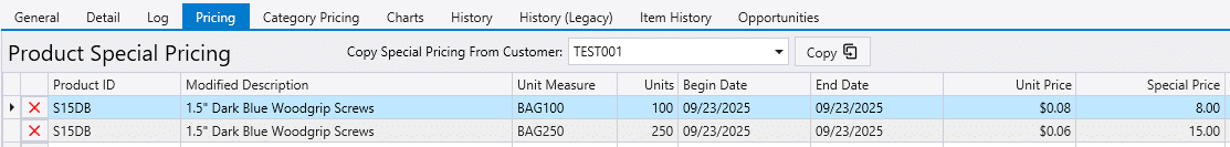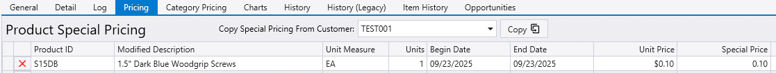 You can specify special prices for individual inventory items for just one customer by entering the product in the customer’s ‘Pricing’ tab. Enter the product, unit of measure, date range that the price is valid, and the special sales price. To make a special price for an inventory item for all customers, see Inventory Special Pricing.