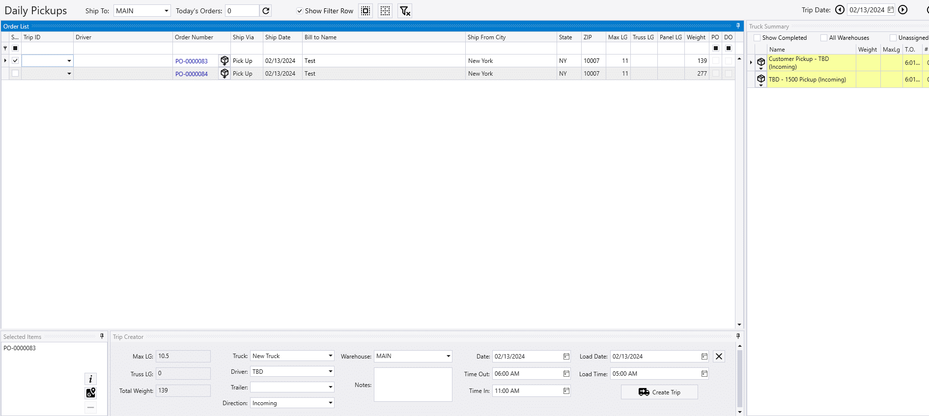 The Daily Pickups screen displays the released purchase orders that need picked up and allows trips to be created for them. Pickups and deliveries from the Daily Deliveries cannot be combined on the same trips.