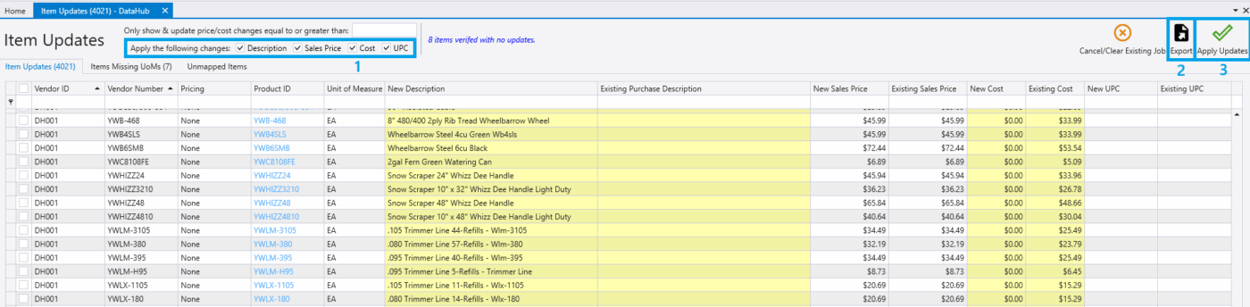 This will show any items that have changes made to them. When finding changes for the unit of measure, DataHub will treat “EA” and “EACH” as the same value. Check the box beside each of the fields that are to be changed [1] and then select the items to be updated. The list will filter to the boxes that are selected here. For example, if “Description” is unchecked and a row only has changes to the description, it will be hidden. Then click “Apply Updates” [3]. The export button [2] can be used to export the item update information to Excel.