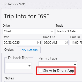 - Manually select trips to show in Driver App – Shows the option to manually select if the trip should be shown in the Driver App Delivery list.
