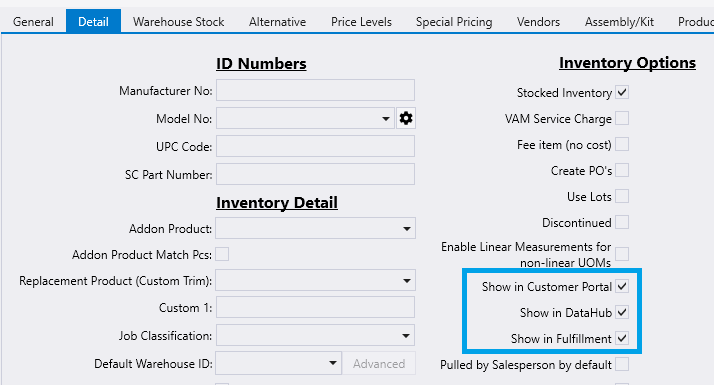 - The Show in Fulfillment check box controls when or not the item will be shown in Fulfillment Pro.