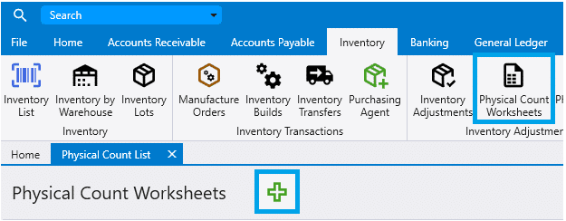 - Go to Inventory > Physical Count Worksheets and create a new worksheet.
