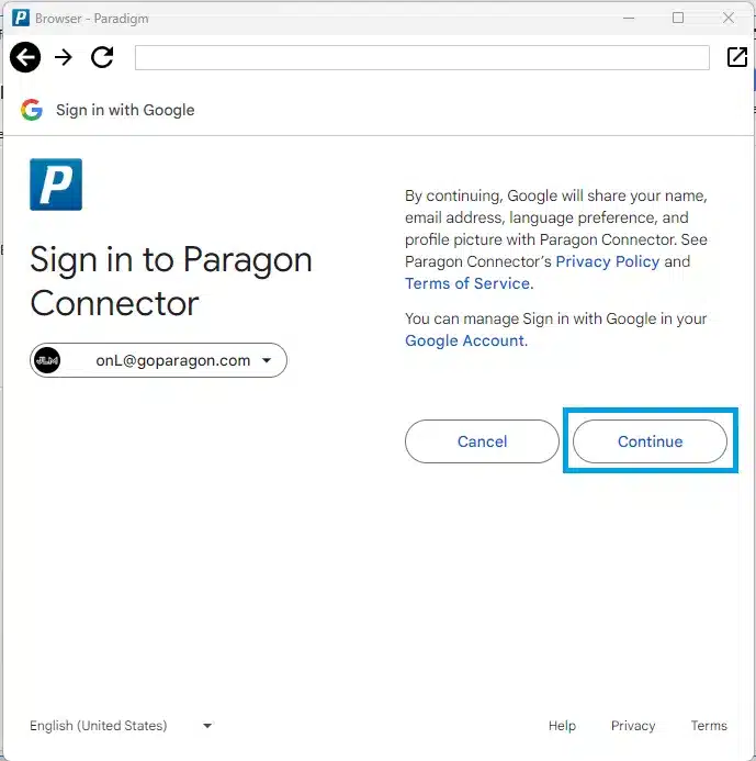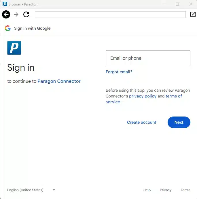 If Google is selected, the external browser will be directed to a Google login page. Use the email account credentials to login.