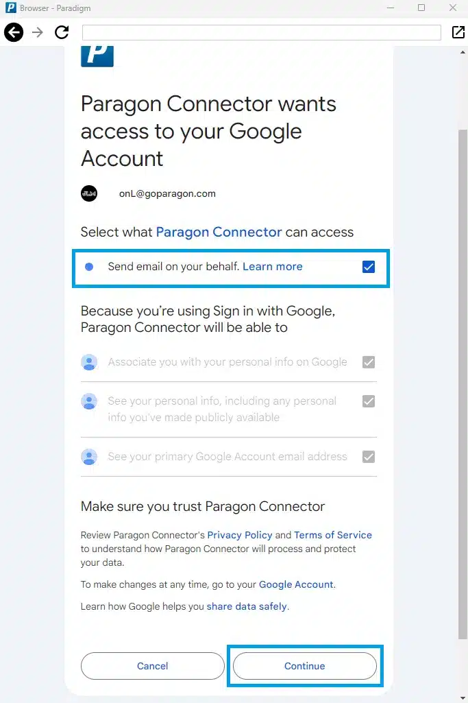 In the next screen, check the box Send email on your behalf. and click Continue.