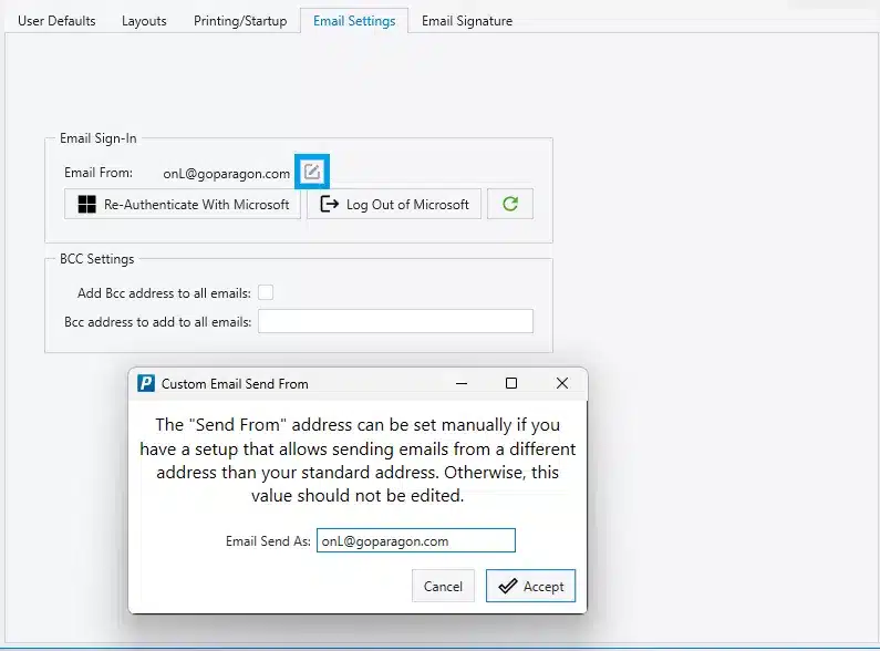 The “Send From” address can be set manually if you are logged in with a Microsoft account and have a setup that allows emails from a different address than your standard address. Otherwise, this value should not be edited.