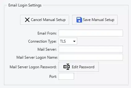 Email settings can be entered manually if needed, by using the “Manual Setup” button. A search online may be needed on how to configure the program being used for email to accept emails from other programs.