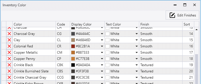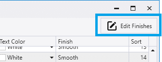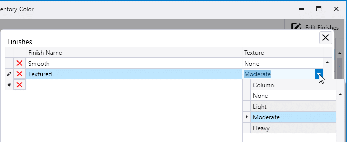 The options for what paint finishes show in the drop down for this column can be edited by clicking on the Edit Finishes button at the top right corner of the Inventory Color window. The Finish Names must be unique. Each Finish can be paired with one of the four Texture options: None, Light, Moderate, and Heavy.