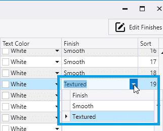 Use drop down in the Finish column to select the Finish for each color.