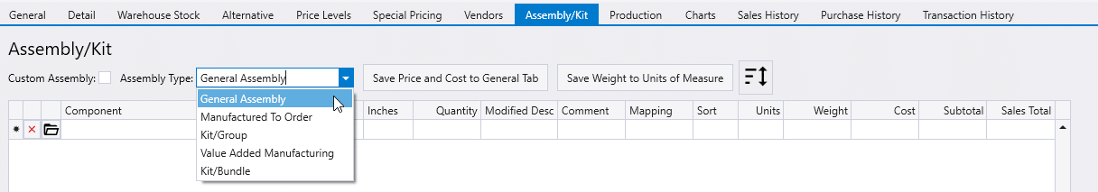 - If ‘Custom Assembly’ is not checked, the price, cost, and weight of the item are simply what is defined in that item’s ‘General’ tab, allowing prices to be controlled separately from the component parts. These assemblies are not editable on the order detail.