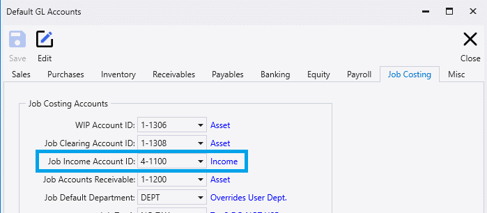 The “Job Income Account” is used as the GL account for final billing. This can be set in the Default GL Account settings.