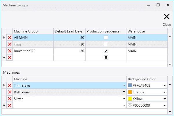 Machine groups are used to show production for a set of machines in the same production screen, when it is filtered to that machine group. This is useful when there are multiple machines that produce mostly the same profiles—some profiles can be run on any of the machines, while others are limited to just one or the other. A machine group allows for them all to be shown in a single list for the operator to then decide which machine to produce it on.