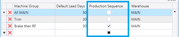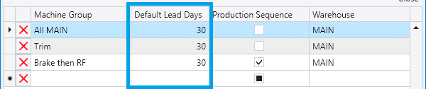 The option for Lead Days defines how many business days before an order’s ship date work for any machine in the group should be scheduled. These group-level Lead Days are applied during production scheduling alongside company and individual machine Lead Days, and affect when orders appear for assignment and planning for that group’s machines.