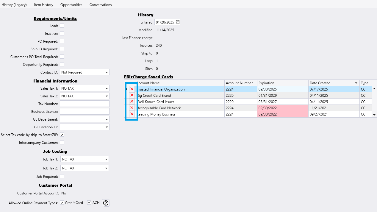 In the Customer Details screen, saved credit cards can be viewed in the table on the right labeled “EBizCharge Saved Cards.” Clicking the red X next to a card entry will send the request to EBizCharge to delete it. Note that all card information displayed in this table is read-only, as it is retrieved from EBizCharge and is not stored in Paradigm’s database.