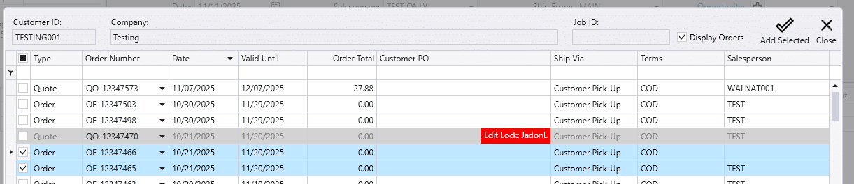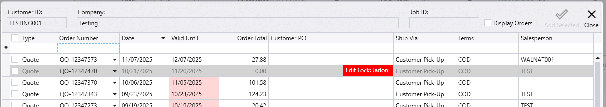 A list of quotes for that customer will appear. Click the check box beside “Display Orders” will show all the open orders as well.