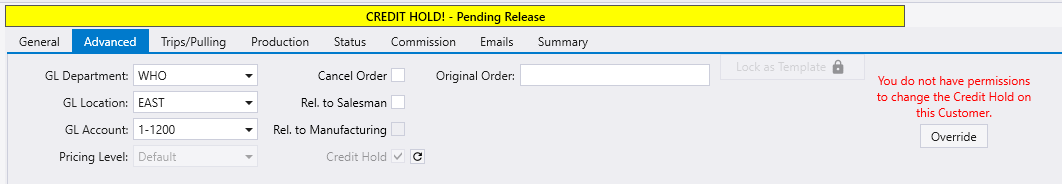 If a customer is on a credit hold, and the user does not have permission to release it, an admin’s login can be used to override it through the advanced tab on the order screen.