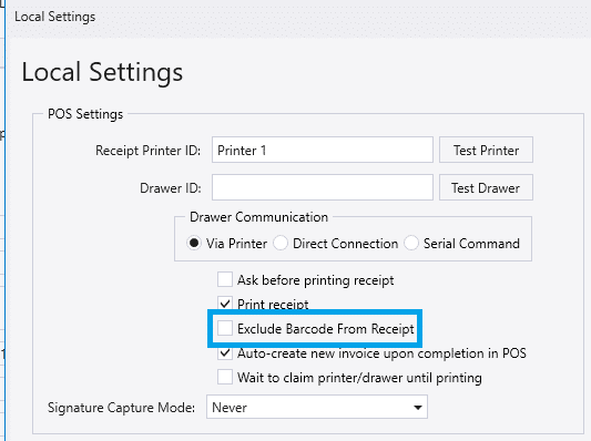 - Exclude Barcode From Receipt – Skips printing barcodes on receipts when enabled. Some old printers don’t support the barcode font that is used.