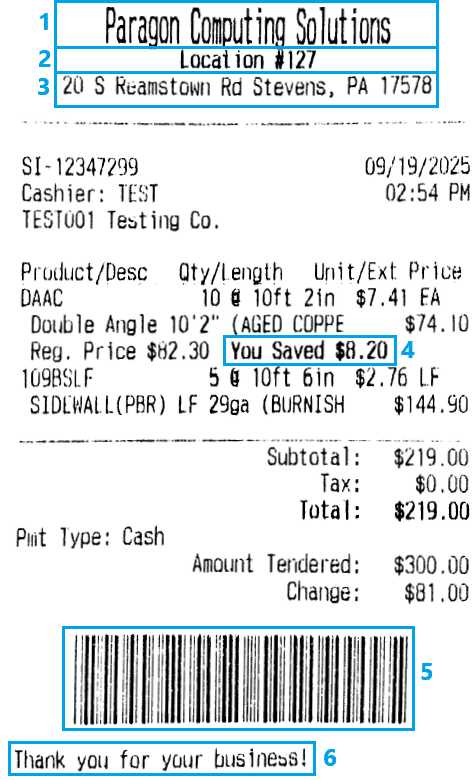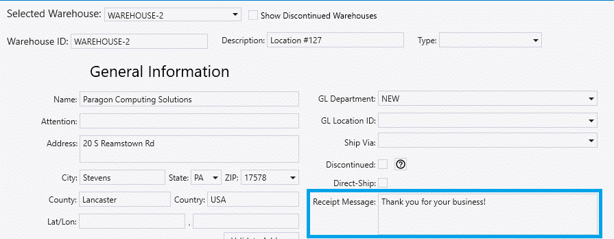6. Receipt Message – This can be set on the warehouse, in the “receipt message” field.