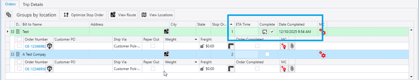 The ETA Date and Time can be filled out or it can be marked as complete here. The trip can also be marked as complete by the driver from Driver App. Paradigm saves the timestamp of when the stop was marked complete, and shows that in the Date Completed column. This timestamp also can be seen on the Sales Order, by viewing the “Trips / Pulling” tab in the Order page header.