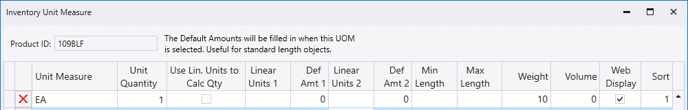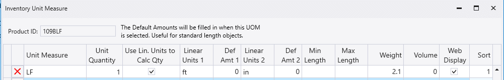 - Min Length & Max Length – A decimal minimum and maximum length in feet allowable for this Unit of Measure.