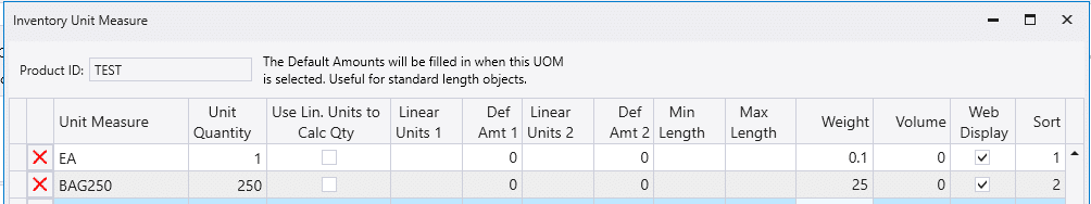- Weight – The weight per unit of measure in pounds. For example if the unit of measure was bags of screws, enter the weight of the whole bag, not the weight per screw.