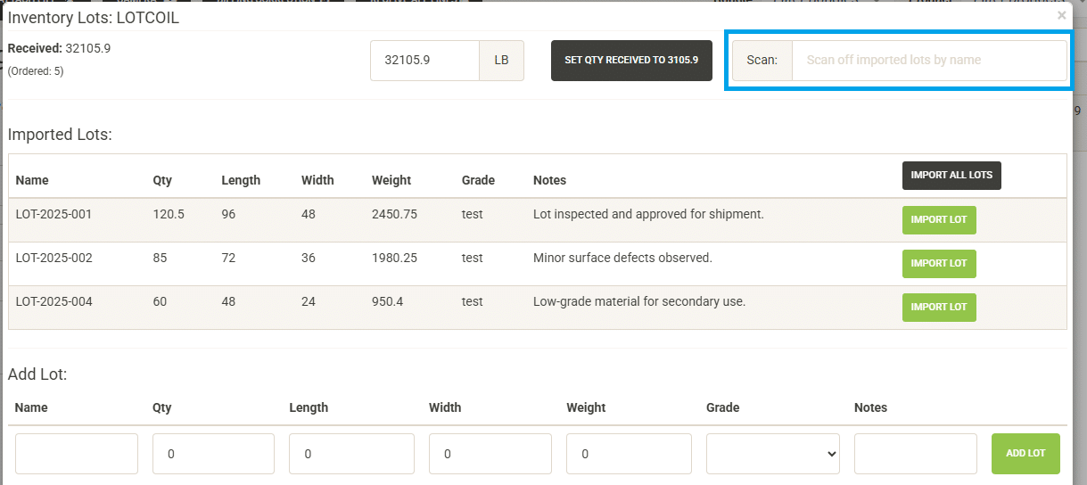 When a user is confirming the received amount in Fulfillment Pro, they will have the option to scan the lot IDs.